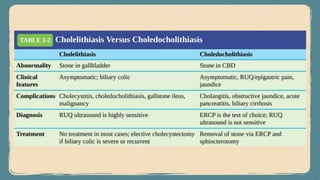 Choledocholithiasis involves stones in the common bile duct, occurring in 10-15% of gallstone patients, predominantly as secondary stones that migrate from the gallbladder. Clinical features can include abdominal pain, jaundice, and symptoms may vary from asymptomatic to acute conditions. Diagnosis typically involves ERCP as the gold standard, with treatment options including ERCP with sphincterotomy and laparoscopic choledocholithotomy in select cases.