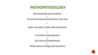 Cholelithiasis is the presence of gallstones in the gallbladder, affecting 6% of adult men and 10% of adult women in the U.S. These stones form due to bile supersaturation with cholesterol, excessive bilirubin, or improper gallbladder emptying, leading to symptoms such as abdominal pain, jaundice, and digestive issues. Management includes medical treatments, surgical options like cholecystectomy, and post-operative care assessments to prevent complications.
