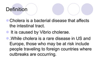 Cholera is a bacterial disease caused by Vibrio cholerae that causes severe watery diarrhea and dehydration. It occurs in outbreaks related to contaminated water supplies in areas with poor sanitation. Clinical presentation includes sudden onset of painless, copious watery diarrhea and vomiting leading to severe dehydration and death if untreated. Diagnosis is confirmed by identifying the bacteria in a stool sample. Treatment focuses on oral rehydration and intravenous fluids to replace fluid and electrolyte losses. Antibiotics are given to shorten the duration of illness and reduce spread.