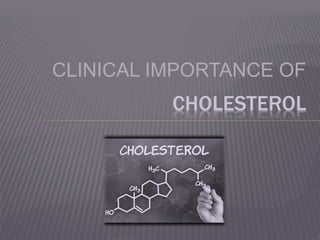 This document discusses cholesterol, including what it is, where it comes from, its functions, and importance in the body. Cholesterol is a lipid found in cell membranes and transported in the blood. It is synthesized in the body and absorbed from dietary sources like eggs. Cholesterol performs essential functions like making cell membranes and producing hormones. It is needed for brain and nerve function and plays an important role in many vital bodily processes. Too much cholesterol can accumulate in arteries and lead to health issues, but it also has protective functions and is necessary for overall health.
