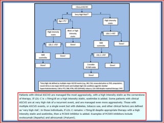 The document provides guidelines for cholesterol management and cardiovascular disease (CVD) risk assessment. It discusses guidelines for measuring cholesterol and lipid levels, calculating LDL and VLDL values, and assessing CVD risk. It recommends starting moderate- or high-intensity statin therapy for most adults aged 40-75 years with diabetes or LDL ≥70 mg/dL. For those without diabetes but with a CVD risk of 7.5% or higher, it recommends discussing statin therapy. The guidelines also provide recommendations for managing statin side effects, evaluating risk factors, and refining risk assessment using coronary artery calcium scoring. The main messages are to emphasize lifestyle changes, use high-intensity statins for high-risk patients, and consider patient risk