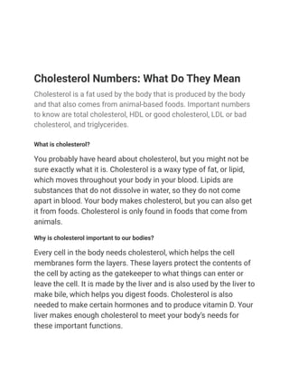 Cholesterol is a fatty substance produced by the body and consumed in animal foods. There are different types of cholesterol - LDL is "bad" cholesterol that can clog arteries, while HDL is "good" cholesterol that removes LDL from arteries. Cholesterol levels are measured through a blood test, with normal or desirable levels varying by age and sex. High cholesterol can increase heart disease risk if not managed.