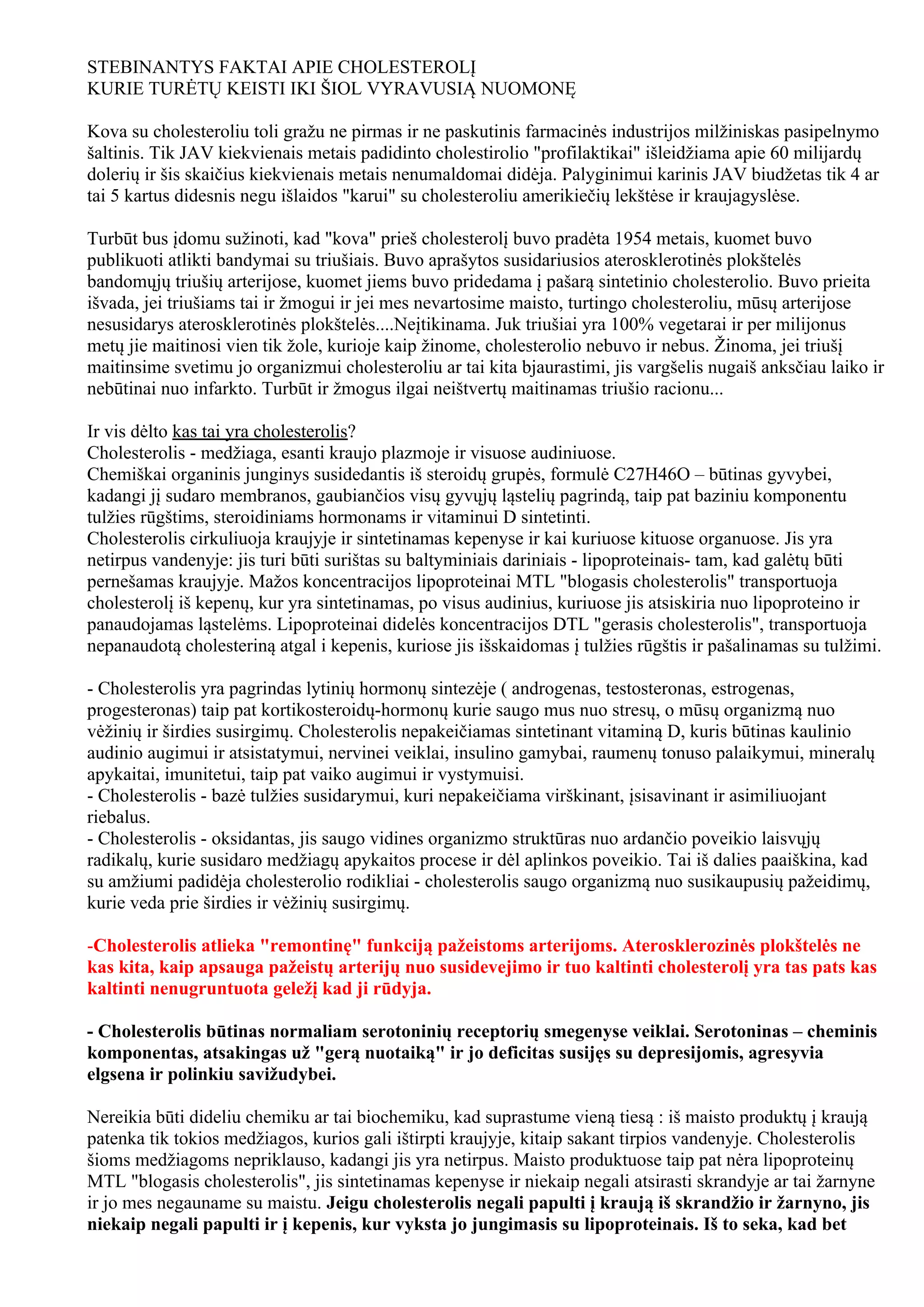 prisiminkite "kad cholesterolis yra nepakeičiamas mūsų organizmui", nekalbant jau apie tai, kaip mums