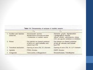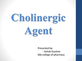 This document discusses cholinergic agents, which are drugs that produce effects similar to acetylcholine by directly interacting with cholinergic receptors or increasing acetylcholine availability. It classifies cholinergic agonists and anticholinesterases. Cholinergic agonists include acetylcholine and analogs like methacholine and carbachol. Anticholinesterases reversibly or irreversibly inhibit the enzyme acetylcholinesterase, leading to acetylcholine accumulation. Common anticholinesterases discussed are physostigmine, neostigmine, pyridostigmine, and organophosphates. The document provides examples of clinical uses and synthesis for several cholinergic agents.