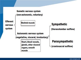 This document discusses the autonomic nervous system and cholinergic transmission. It describes the sympathetic and parasympathetic divisions of the ANS, including the locations of preganglionic and postganglionic neurons. Acetylcholine is the main neurotransmitter of cholinergic fibers. Both muscarinic and nicotinic receptors are involved in cholinergic signaling. Cholinergic drugs include direct agonists like acetylcholine and indirect agonists that inhibit acetylcholinesterase. Anticholinergic drugs act as muscarinic receptor antagonists and are used to treat various conditions.