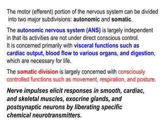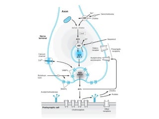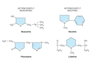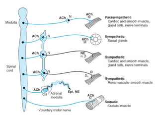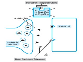 This document discusses cholinomimetic drugs and acetylcholine (ACh) signaling in the nervous system. It begins by describing the autonomic and somatic divisions of the nervous system. It then discusses how ACh acts as a neurotransmitter at cholinergic synapses in both divisions. Cholinomimetic drugs can be direct agonists that mimic ACh or indirect inhibitors of acetylcholinesterase (AChE) to prolong the actions of endogenous ACh. Examples of direct agonists include pilocarpine and nicotine. Indirect agonists like galantamine and donepezil inhibit AChE. The document provides detailed information on the mechanisms and clinical uses of various cholinomime