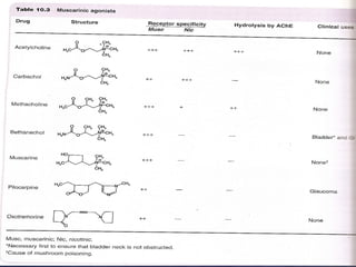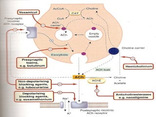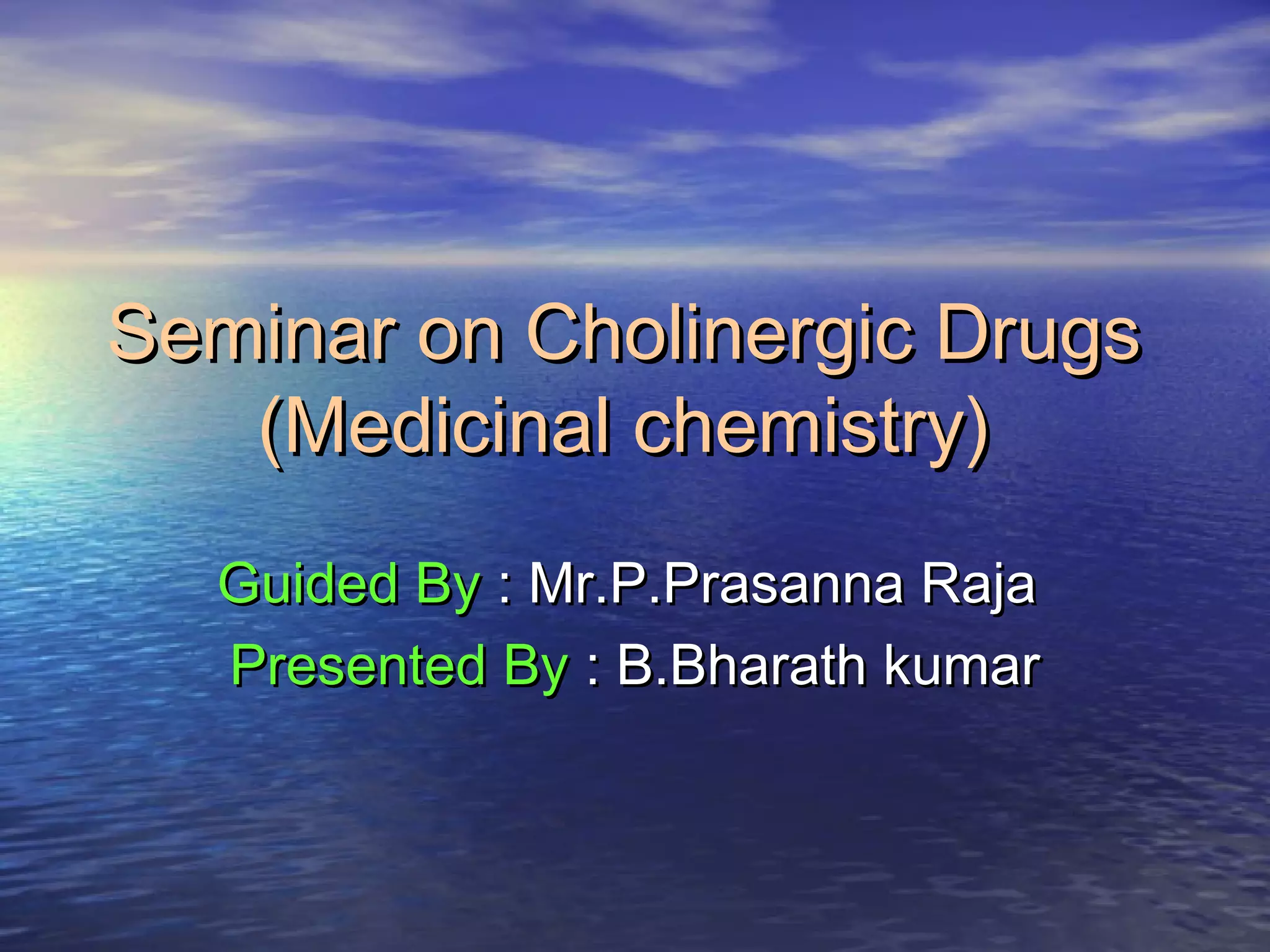 The seminar discusses cholinergic drugs, which affect the autonomic nervous system and are classified into muscarinic and nicotinic receptors based on their action. Key topics include the synthesis and release of acetylcholine, types of cholinergic agents, and their physiological effects, along with clinical applications in conditions such as glaucoma and myasthenia gravis. The document also covers the structure and modifications of these drugs, as well as references for further reading.