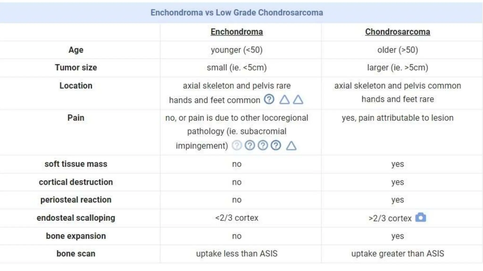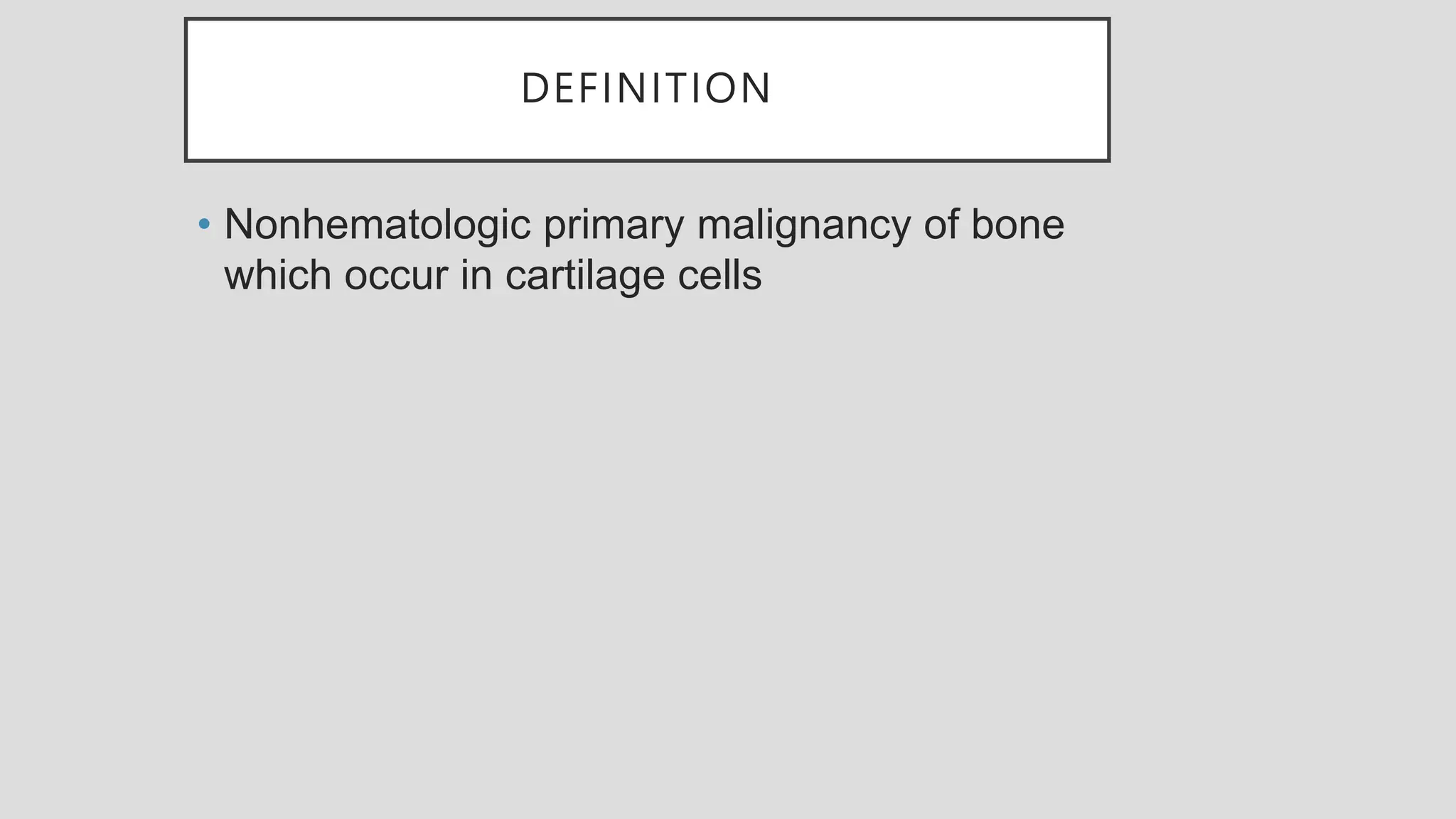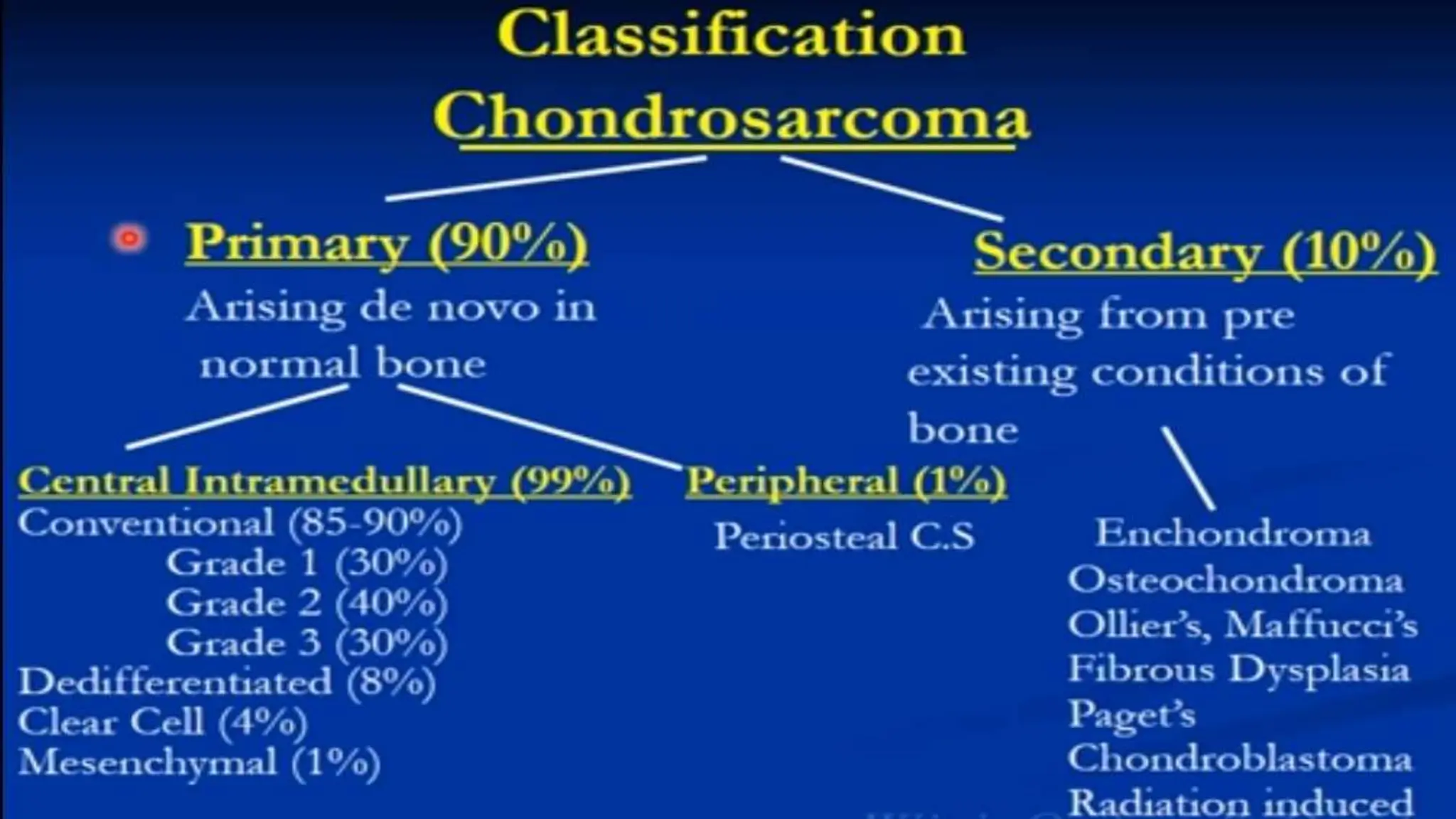 Chondrosarcoma is a primary bone malignancy arising from cartilage cells, primarily affecting the proximal femur, distal femur, and pelvis, with higher occurrence in males. The disease can be categorized into different grades based on cellularity and pathology, with treatment options including wide excision and possible radiation therapy for unresectable cases. Secondary chondrosarcomas develop from pre-existing lesions like osteochondromas and can show varied radiographic features, necessitating specialized clinical management.