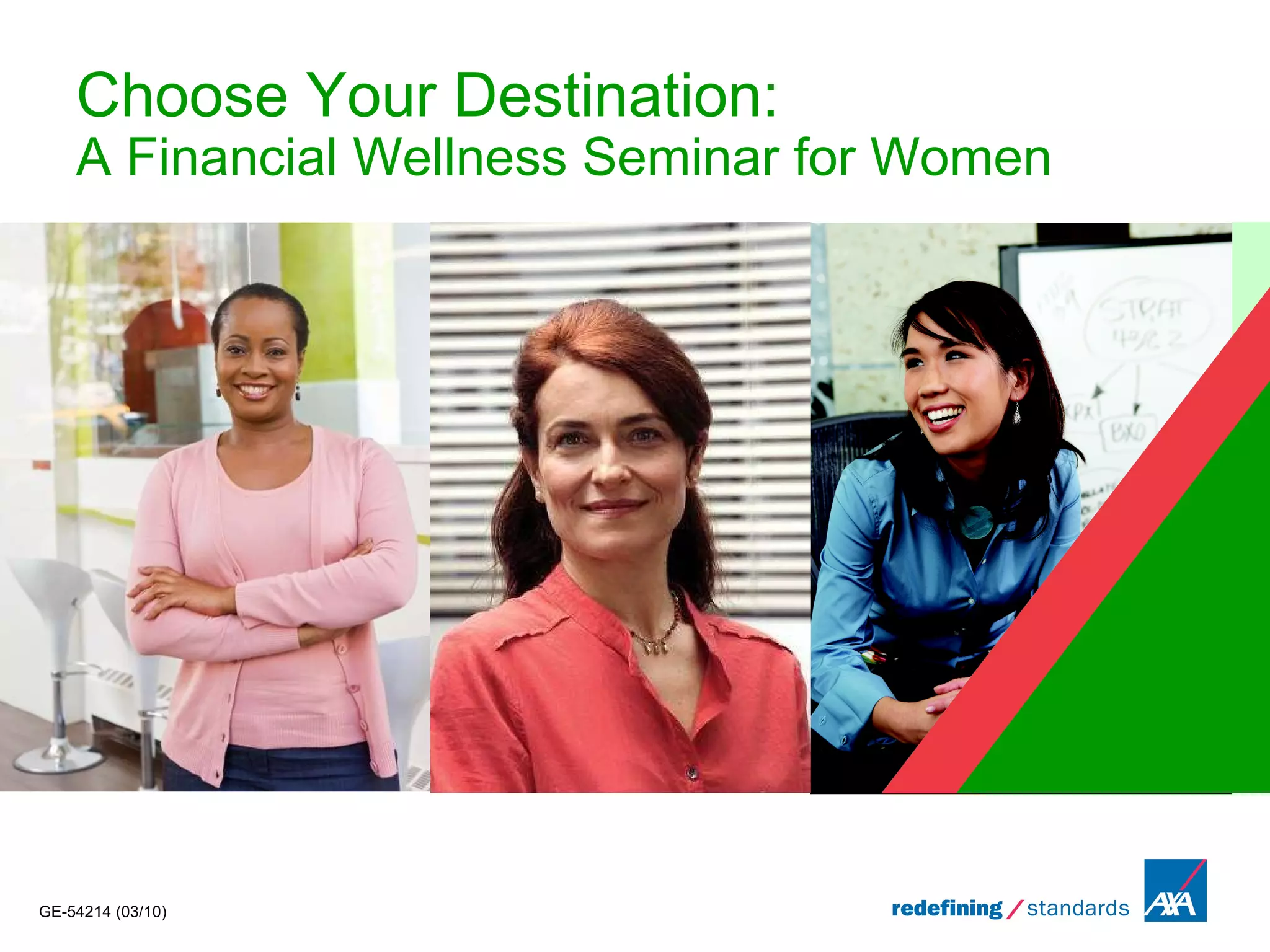 The document outlines a financial wellness seminar aimed at educating women about financial strategies throughout their lives, emphasizing the importance of planning for various stages of life. It discusses statistics on women's participation in the workforce and the unique financial challenges they face, including caregiving responsibilities and retirement planning. Additionally, it provides guidance on setting financial goals, investment strategies, and the importance of consulting with financial professionals.