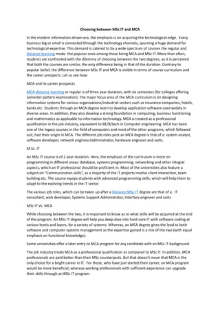 The document compares the MSc IT and MCA degrees. [1] MCA is a 3-year degree that focuses on designing information systems and applications for organizations, providing a strong foundation in computing, business, and mathematics. [2] Graduates can work as system analysts, software developers, network engineers, and hardware engineers. [3] MSc IT is a 2-year degree emphasizing programming in areas like databases, networking, and communication skills for client interaction. Graduates can work as IT consultants, web developers, and systems administrators.