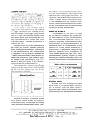 This document discusses the importance of choosing the correct coaxial cable for CCTV systems. It outlines the various components and parameters to consider when selecting cable, including the center conductor material, dielectric material, shield type, jacket material, impedance, and attenuation characteristics. Copper is recommended for the center conductor over copper-coated steel. Proper cable type, installation, and termination techniques are also covered to ensure optimal video signal transmission and system performance.
