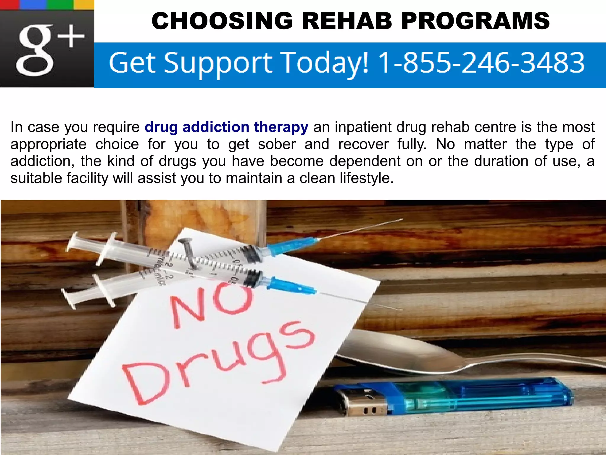 The document discusses choosing rehab programs for drug addiction. It states that an inpatient drug rehab center is the best choice to get sober and recover fully. Inpatient programs offer both individual and group therapy sessions, and allow patients to choose treatment options that fit their needs best. They also provide around-the-clock support from onsite staff to help patients through recovery without access to drugs. The document recommends that patients consider an inpatient program's treatment duration and support system, as this type of comprehensive care can be just what is needed to successfully tackle an addiction.