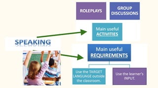This document summarizes a presentation on speaking skills in a second language. It discusses that speaking is often seen as the most difficult skill to master due to the need to consider sociocultural norms, context, and make quick decisions without preparation. Speaking requires mastery of vocabulary, syntax, intonation and discourse markers. Learners can develop compensatory strategies and engage in activities like storytelling and discussions. Maintaining turn-taking, accommodating the listener, and exchanges between native and nonnative speakers are also reviewed. The role of L1 and L2 in interaction and teaching speaking in the classroom are discussed.