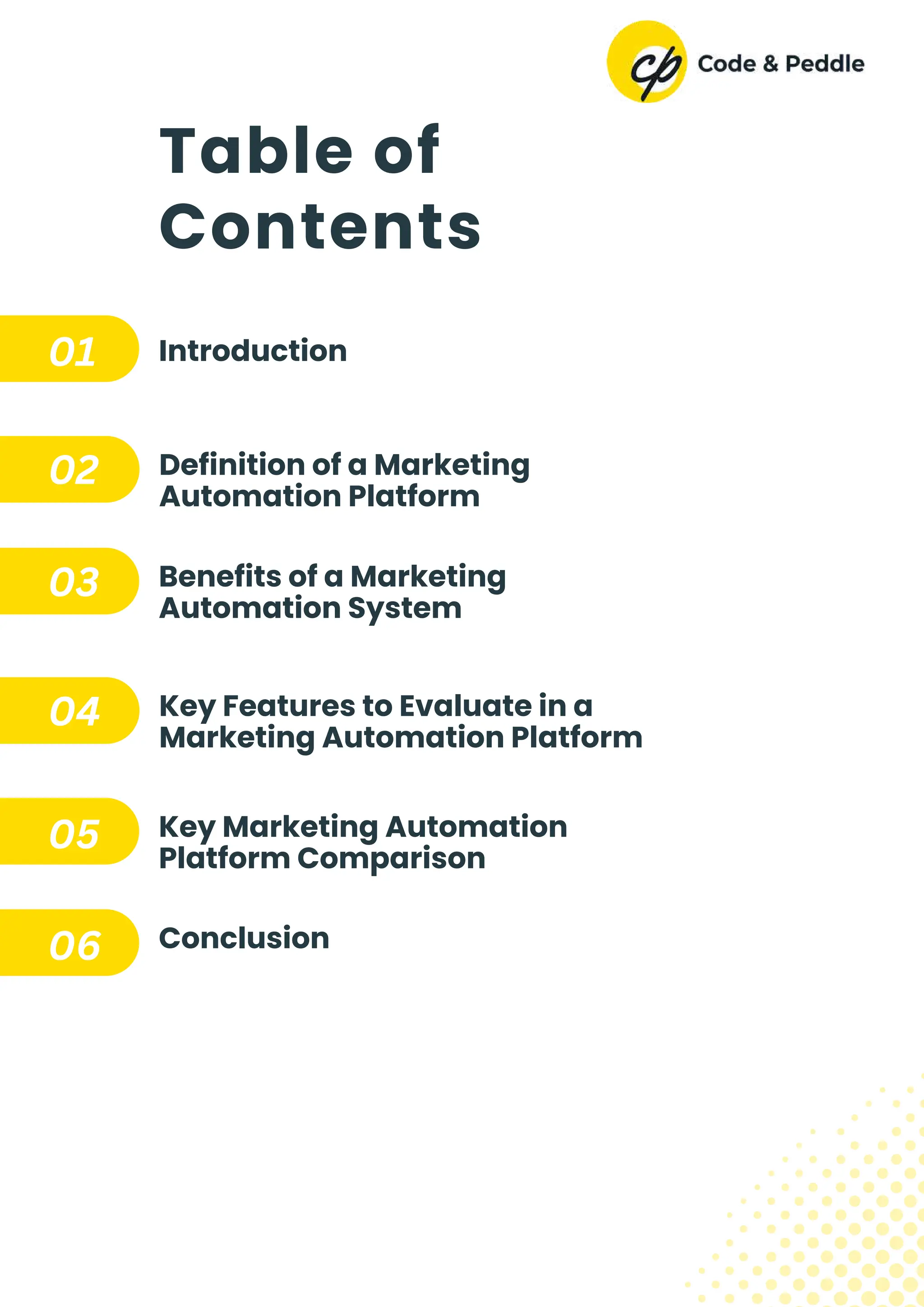 This document provides a comprehensive guide for selecting the right marketing automation platform, comparing six leading options: HubSpot, Marketo, Pardot, Mailchimp, ActiveCampaign, and Snov.io. Key considerations include aligning the platform features with business needs, integration capabilities, pricing models, and scalability. The whitepaper also highlights the benefits of marketing automation such as improved lead management, collaboration between sales and marketing teams, and enhanced ROI.