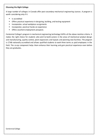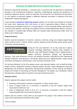 Centennial College offers a three-year Mechanical Engineering Technology program focused on practical applications of engineering principles with extensive hands-on experience. The curriculum covers fundamental engineering topics and specialized subjects while incorporating industry field placements to enhance learning. Admission requires a secondary school diploma and specific English and mathematics grades, ensuring students are well-prepared for careers in mechanical design, quality control, and manufacturing.
