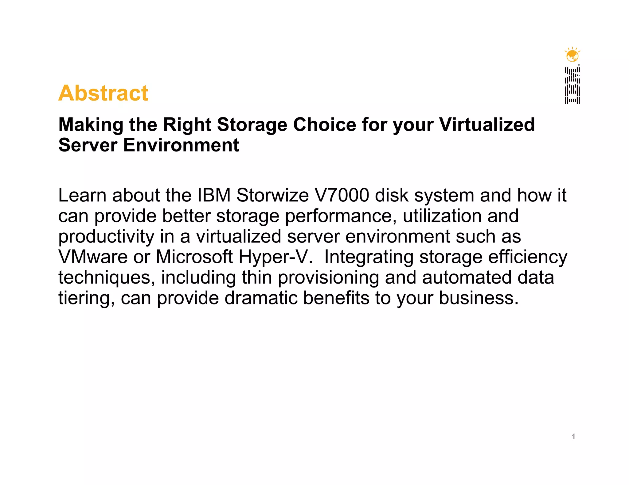 The document discusses storage options for virtualized server environments. It describes the IBM Storwize V7000 disk system, which provides storage performance, utilization and productivity benefits. Key features include multi-platform support, performance optimization, built-in advanced functionality to reduce costs, and high availability and disaster recovery features. The Storwize V7000 uses thin provisioning, automated tiering, replication and data migration to improve efficiency.