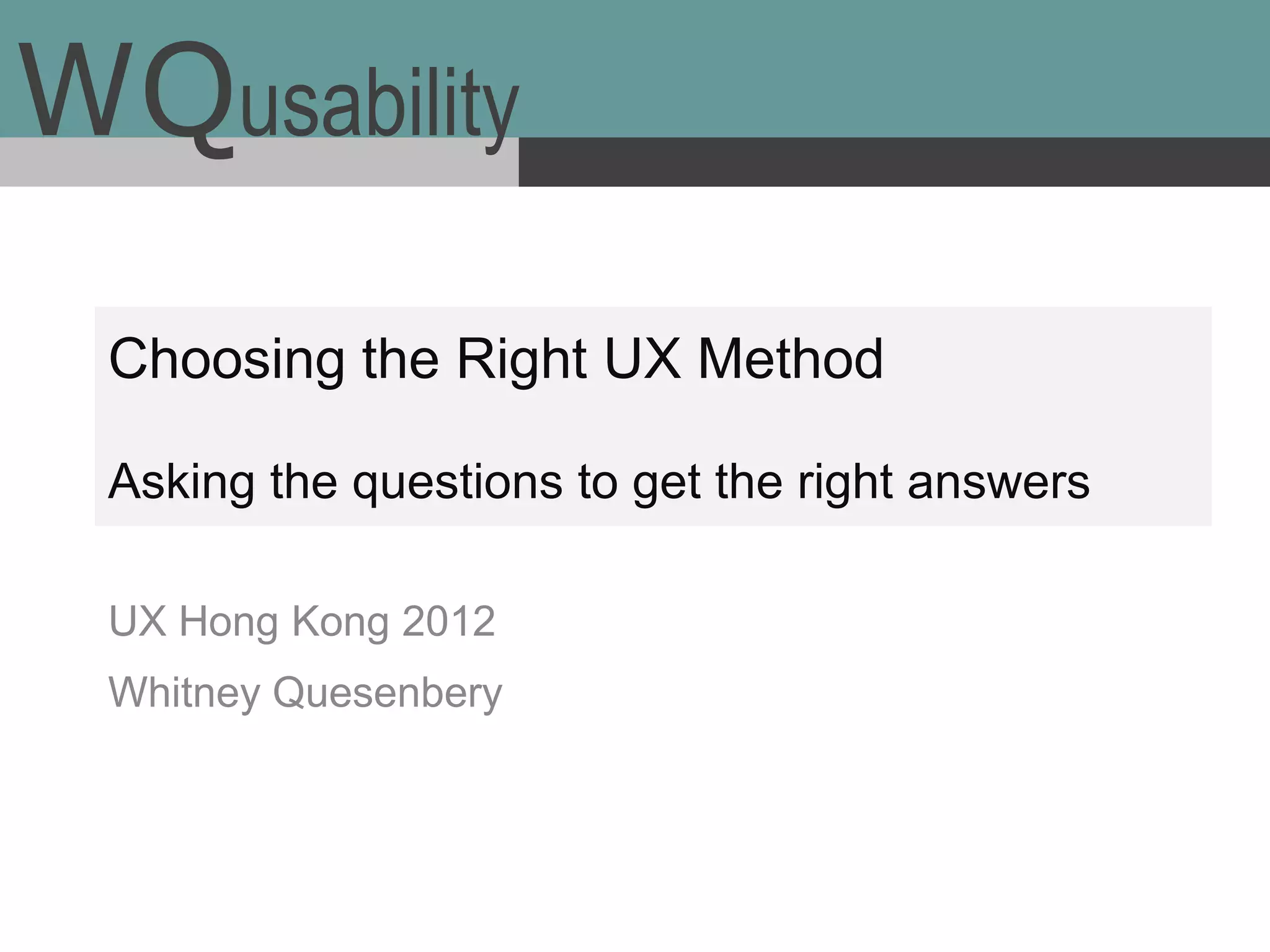 This document discusses user experience (UX) methods and how to choose the right method for a project. It emphasizes understanding the questions that need answers and exploring different ways to get those answers. The document provides examples of mixing methods, such as combining interviews with participatory design. It also discusses adjusting methods based on constraints like resources, time, and access to users. The overall message is that UX planning should focus on the research questions rather than following an ideal process, and can be more creative by considering these types of constraints.