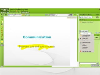 The document discusses various methods for communicating with students in online courses. It suggests using tools that students are familiar with and can integrate with each other to enable student engagement and contributions. Some synchronous communication methods mentioned include video conferencing platforms for guest speakers or live office hours. Asynchronous methods include course blogs for sharing content and course wikis for less structured discussions. Embedded chat within existing course sites is also suggested for real-time question and answer sessions.