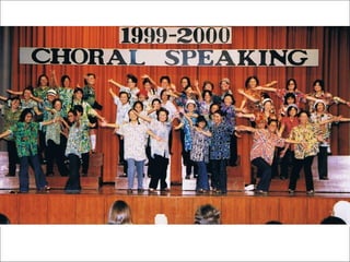 The document outlines essential considerations for training students in choral speaking, including understanding the poet's intention, identifying shifts in mood, and recognizing important lines and their beginnings and endings. It emphasizes the variation of pitch, pace, and volume for impactful delivery, as well as the significance of calculated student movements and costume choices during performances. Additionally, it addresses potential challenges faced by teachers and students, highlighting the educational benefits of engaging in this art form.