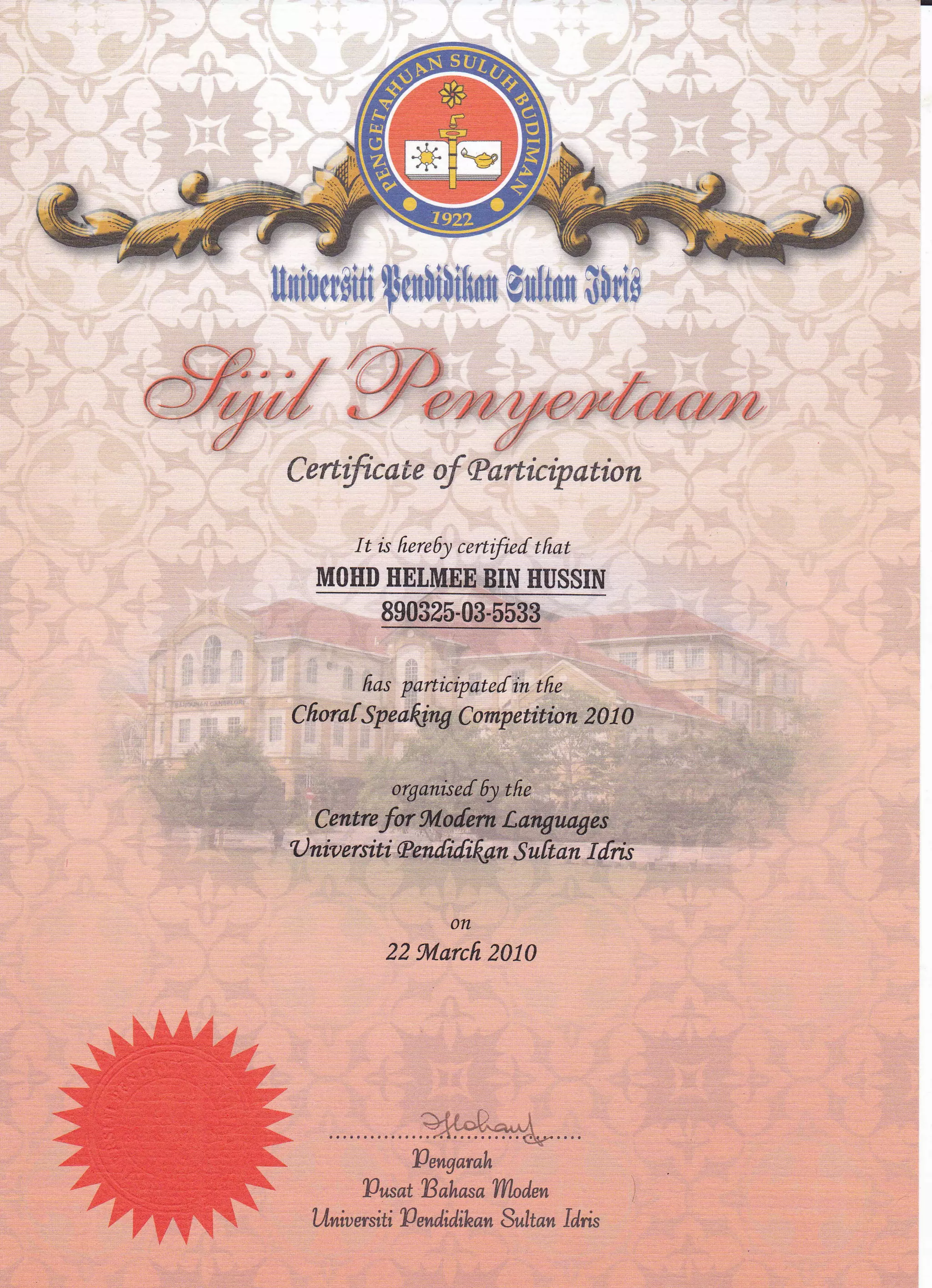 Mohd Helmi Bin Hassan participated in the Choral Speaking Competition 2010 organized by the Centre for Modern Languages at Universiti Sultan Zainal Abidin on March 22, 2010. The certificate confirms his participation and is signed by the Vice-Chancellor of the university.