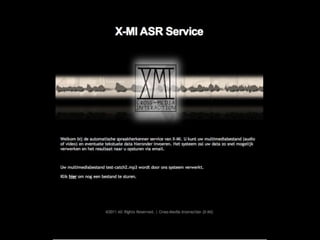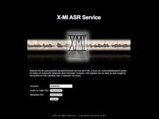 Service front-end: statushuidigeimplementatie:status updates via email such asjob started on X-MI ASR SERVICEwe are sorry but you have exceeded your quota for your accountwe received your file. Your job is being prepared to be processedwe have finished the ASR process. The transcription will be send to you in a separate mail