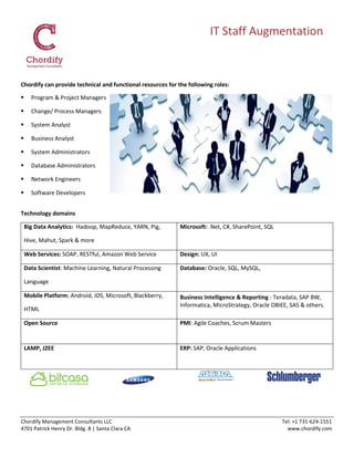 Chordify Management Consultants provides IT staff augmentation and consulting services with a focus on big data analytics, visualization, mobile and cloud applications, and business intelligence application development and integration. They have over 3,000 consultants who help global Fortune 1000 companies and small/medium businesses implement IT solutions. Chordify prides itself on adopting a data-driven approach and measuring the effectiveness of its service delivery.