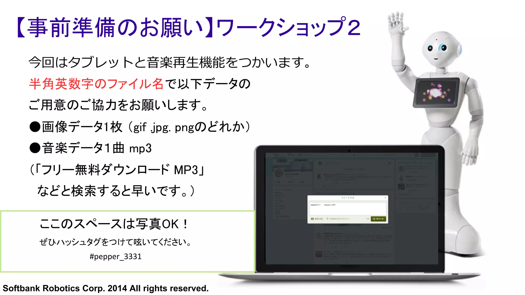 2014 All rights reserved. ここのスペースは写真OK! ぜひハッシュタグをつけて呟いてください。 #pepper_3331 【事前準備のお願い】ワークショップ2 今回はタブレットと⾳音楽再⽣生機能をつかいます。 半角英数字のファイル名で以下データの ご用意のご協力をお願いします。 ● 画像データ1枚 (gif .jpg. pngのどれか) ● 音楽データ1曲 mp3 (「フリー無料ダウンロード MP3」 などと検索すると早いです。)