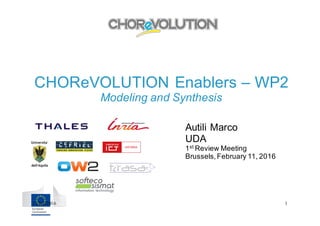 The document outlines the objectives and tasks of the Chorevolution WP2 project, focused on choreography modeling and synthesis. It describes deliverables, collaboration among service providers, and the tools used for automatic choreography synthesis to assist users in achieving business goals. The concluding section summarizes progress and future steps in integrating and automating related processes.