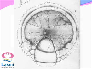 This document discusses choroidal coloboma, beginning with definitions and epidemiology. It describes the embryonic development of the eye and how failure of fusion of the embryonic fissure can result in coloboma. Types of coloboma are classified based on location and presence of other anomalies. Complications like retinal detachment are discussed. Management of cataracts and other ocular issues in the context of coloboma are covered. The prognosis depends on factors like presence of microphthalmos, corneal diameter, and type and timing of surgery.