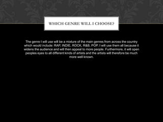This document discusses choosing genres of music for a new music magazine. It will include a mixture of rap, indie, rock, R&B, and pop genres to appeal to a wider audience and expose people to more artists. Using multiple popular genres will help make more artists well known.