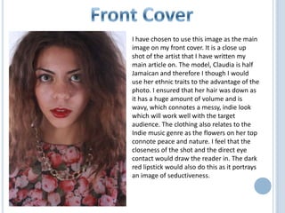 The document discusses the selection and use of various images of artist Claudia in a magazine article and layout. Several photos are chosen to be used as the main cover image, on the contents page, as double page spreads, full page images, and in a collage to introduce, feature, and conclude the article on Claudia. The photos are intended to portray Claudia's indie image through her clothing, hair, and direct eye contact with the viewer in order to draw in the target audience and entice readers to learn more about her.