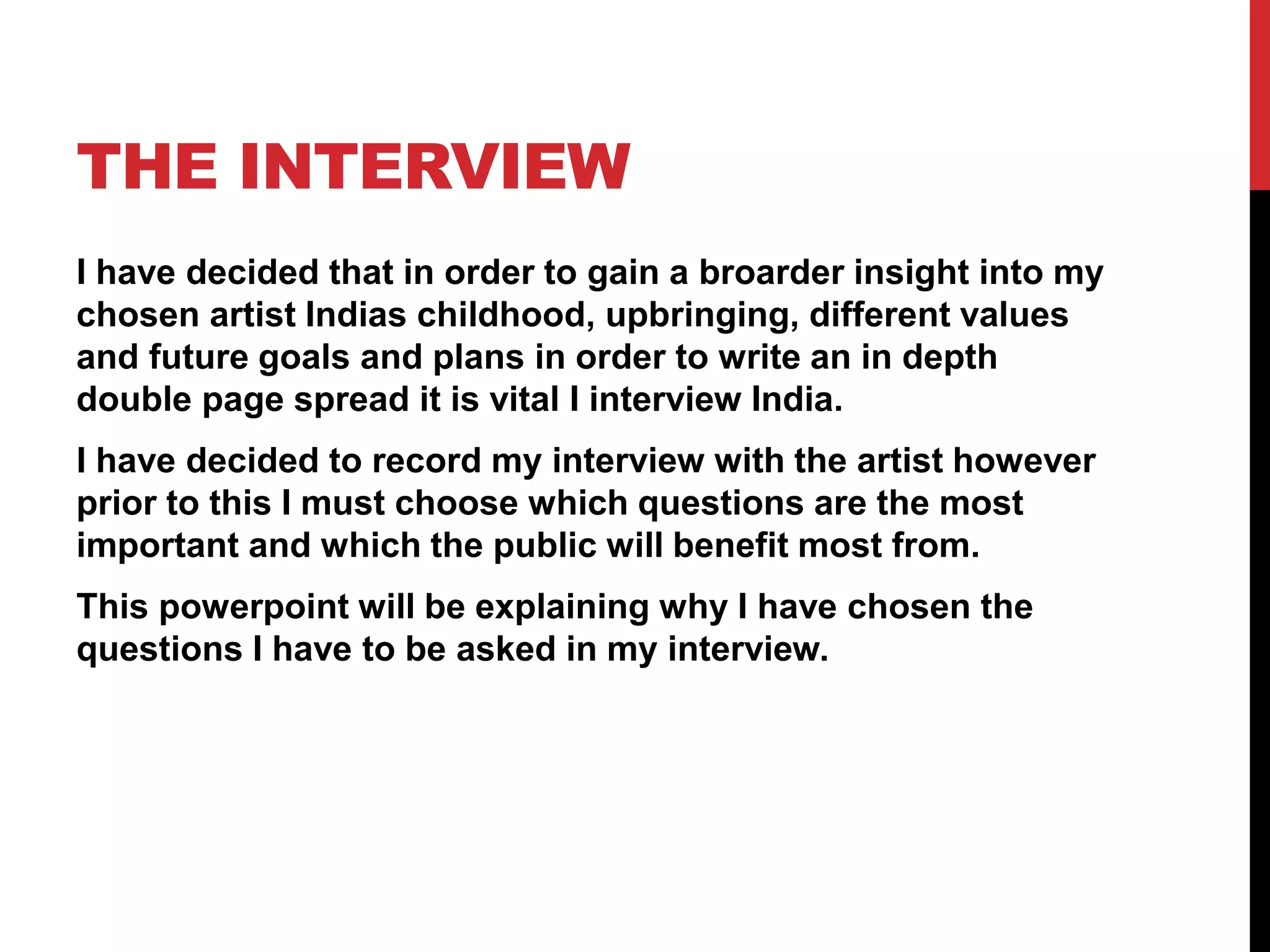 This document discusses the questions that will be asked in an interview with the artist India. The questions are: