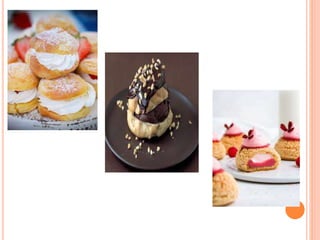 Choux pastry is a versatile and crisp pastry that can be shaped, filled, and coated with various toppings. The document outlines the principles for making choux pastry, including ingredient preparation, mixing methods, and baking conditions to achieve the desired texture. It also identifies common faults in choux pastry production, such as sogginess, heaviness, lack of crispness, and shrinkage, along with their causes.