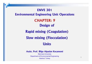 This document provides information on the design of rapid mixing (coagulation) and slow mixing (flocculation) units in water treatment. It discusses the objectives and design criteria for rapid mixing units, which is to provide complete mixing of coagulant and raw water over 20-60 seconds at 700-1000 sec-1. Slow mixing units called flocculators are used to promote particle aggregation over longer detention times of 15-30 minutes at lower velocity gradients of 10-100 sec-1. Tapered flocculation is described as a method to vary velocity gradients from higher to lower values through a basin to form dense, rapidly settling flocs. Examples are provided for designing paddle wheel and baffled channel flocculators