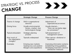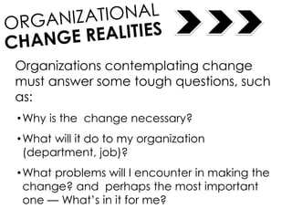 This document discusses organizational change and excellence. It addresses questions organizations should consider when contemplating change, such as why change is necessary and how it will impact the organization. There are two types of change: strategic change which stems from external opportunities and challenges, and process change which deals with internal operations. Culture and leadership are also important for achieving excellence. Change is difficult and will face resistance, so full participation is needed for success.