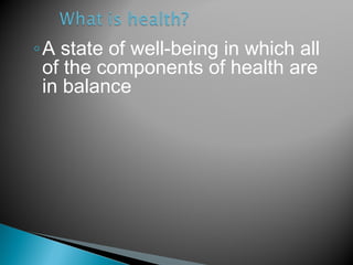 This document outlines the six components of health: physical, social, emotional, mental, environmental, and spiritual. It defines each component and provides examples. Achieving balance across all six components leads to overall well-being. Factors like heredity, social relationships, culture, and environment can also influence a person's health. Maintaining health requires knowledge, making positive lifestyle changes, and having the right attitude.