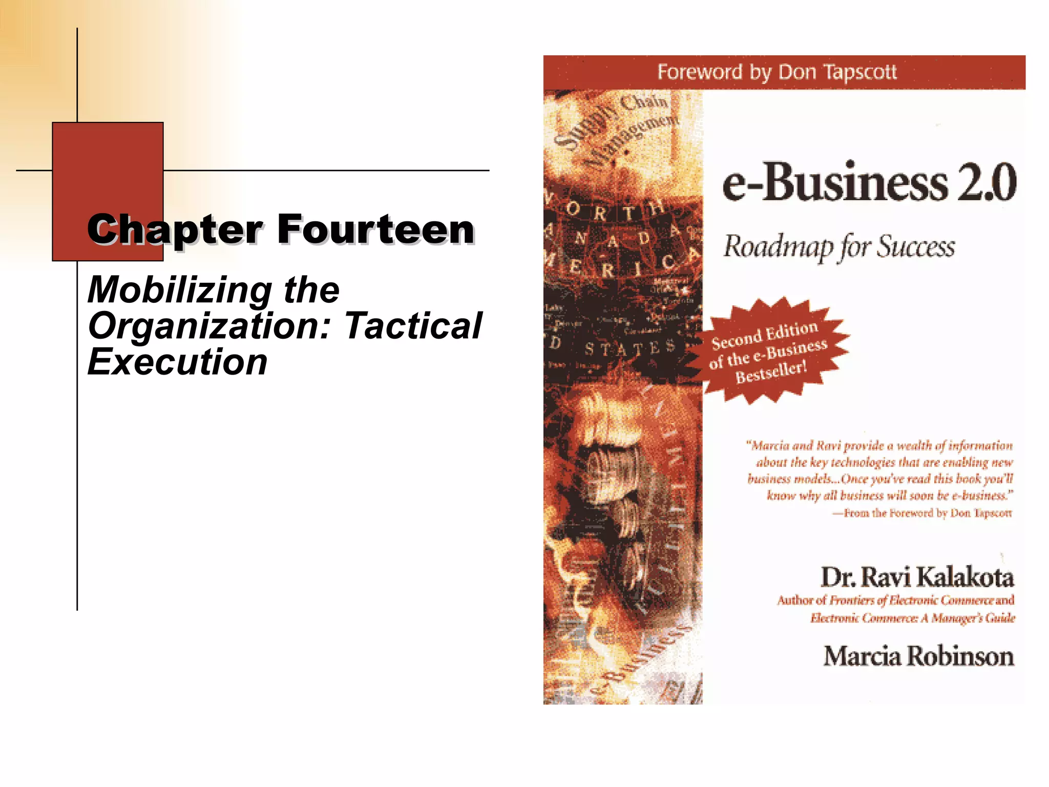 This chapter focuses on the execution of e-business projects and emphasizes the importance of tightly coordinating tactical execution to support the overall strategy and vision. It outlines a process for e-business tactical execution that includes defining projects, establishing teams, developing plans, managing requirements, and adopting and measuring outcomes. Successful execution requires addressing both technical capabilities and organizational readiness, maintaining communication, and focusing on customer needs and pain points.