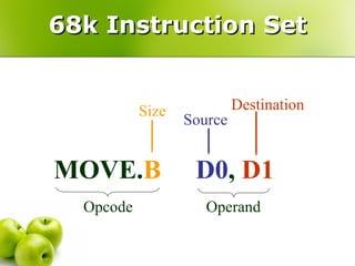 The document provides an introduction to the 68k microprocessor instruction set. It discusses the different types of instructions including data transfer, arithmetic, logical, and bit manipulation instructions. It describes the various addressing modes used by the 68k including register direct, absolute, PC relative, register indirect, and immediate addressing. Examples are given of instructions like MOVE, ADD, SUB, and MUL using different addressing modes and data sizes. The operation of the instruction cycle is explained, showing the fetch, decode, and execute phases for each instruction.