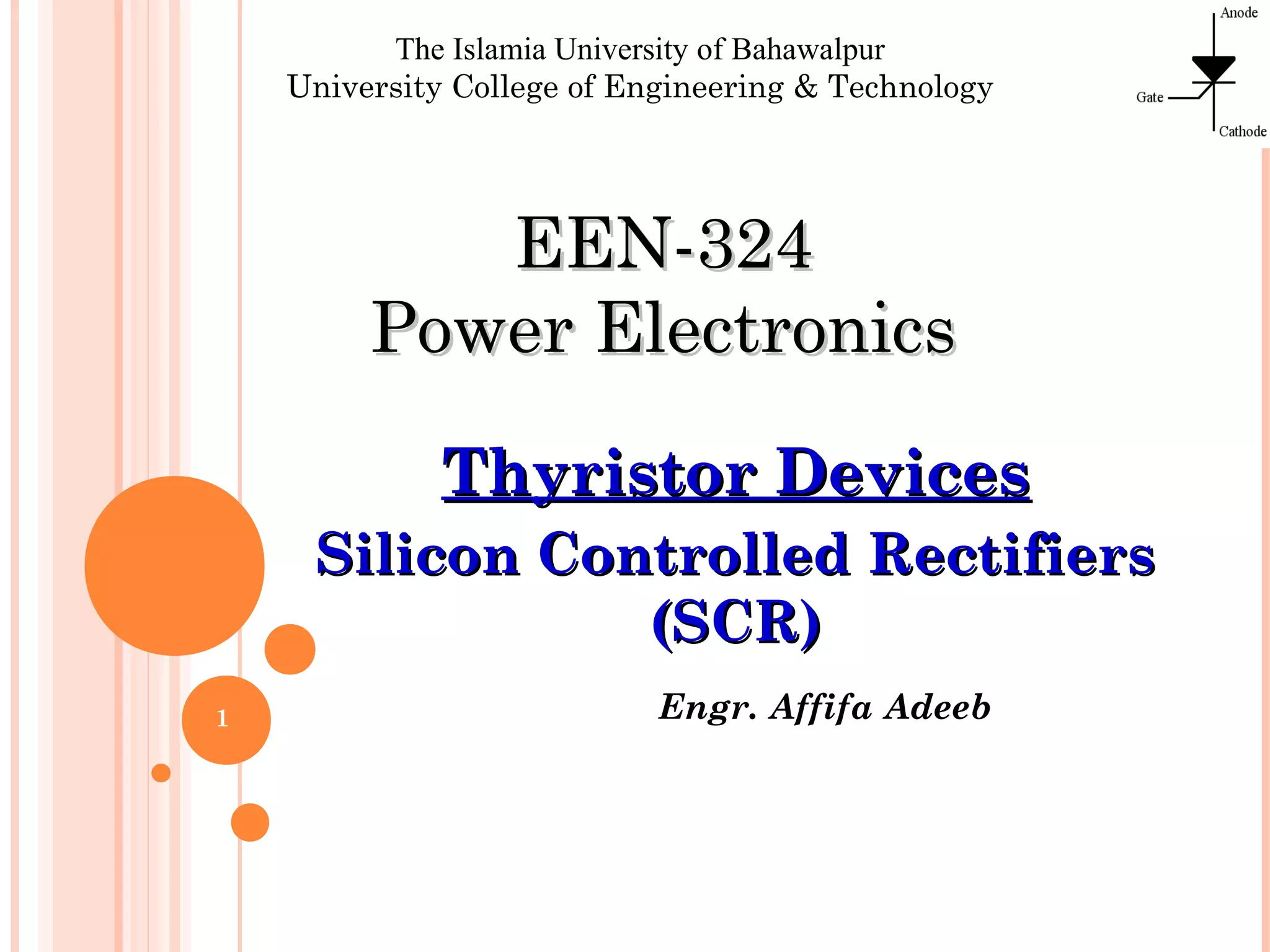 This document discusses thyristor devices, specifically silicon controlled rectifiers (SCRs). It describes the basic structure and operation of SCRs, including how they are turned on through their gate and turned off by reducing their anode current. The document outlines various ratings of SCRs such as current, voltage, and switching ratings. It also discusses how SCRs can be connected in series and parallel and describes different gate triggering and commutation circuits used to control SCR operation. Finally, it briefly introduces some other types of thyristor devices.
