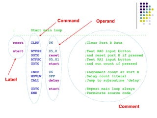 The document discusses assembly language programming for PIC microcontrollers. It covers number representation in assembler, basic elements of PIC assembly like labels, instructions, operands, and directives. It also discusses assembling and linking a PIC program, subroutines, macros, and local directives. An example program is provided to count from 0 to FF and send the count value to port B using subroutines for displaying and delay.