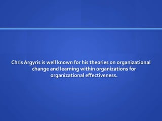 Chris Argyris is known for his theories on organizational learning and effectiveness. He coined the term "action science" which examines how people interact within organizations. Argyris developed theories of single-loop and double-loop learning, where single-loop focuses on techniques and double-loop leads to shifts in strategies and framing of consequences. Double-loop learning can be applied to school administration to promote organizational effectiveness through reviewing and changing practices. While the theory focuses on interactions, it can also support technology integration to enhance teaching and learning. However, the distinction between single and double-loop learning is sometimes vague.