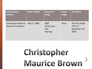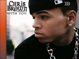 Chris Brown is an American singer, songwriter, dancer and actor born in 1989. He taught himself to sing and dance at a young age and was involved in his church choir. Inspired by Michael Jackson, Brown wanted to initially pursue a career in rap but found success in R&B and pop music. At age 16, Brown released his self-titled debut album featuring the lead single "Run It". Some of his most popular songs include "With You", "No Air", and "Forever", establishing himself as a prominent artist in the late 2000s.