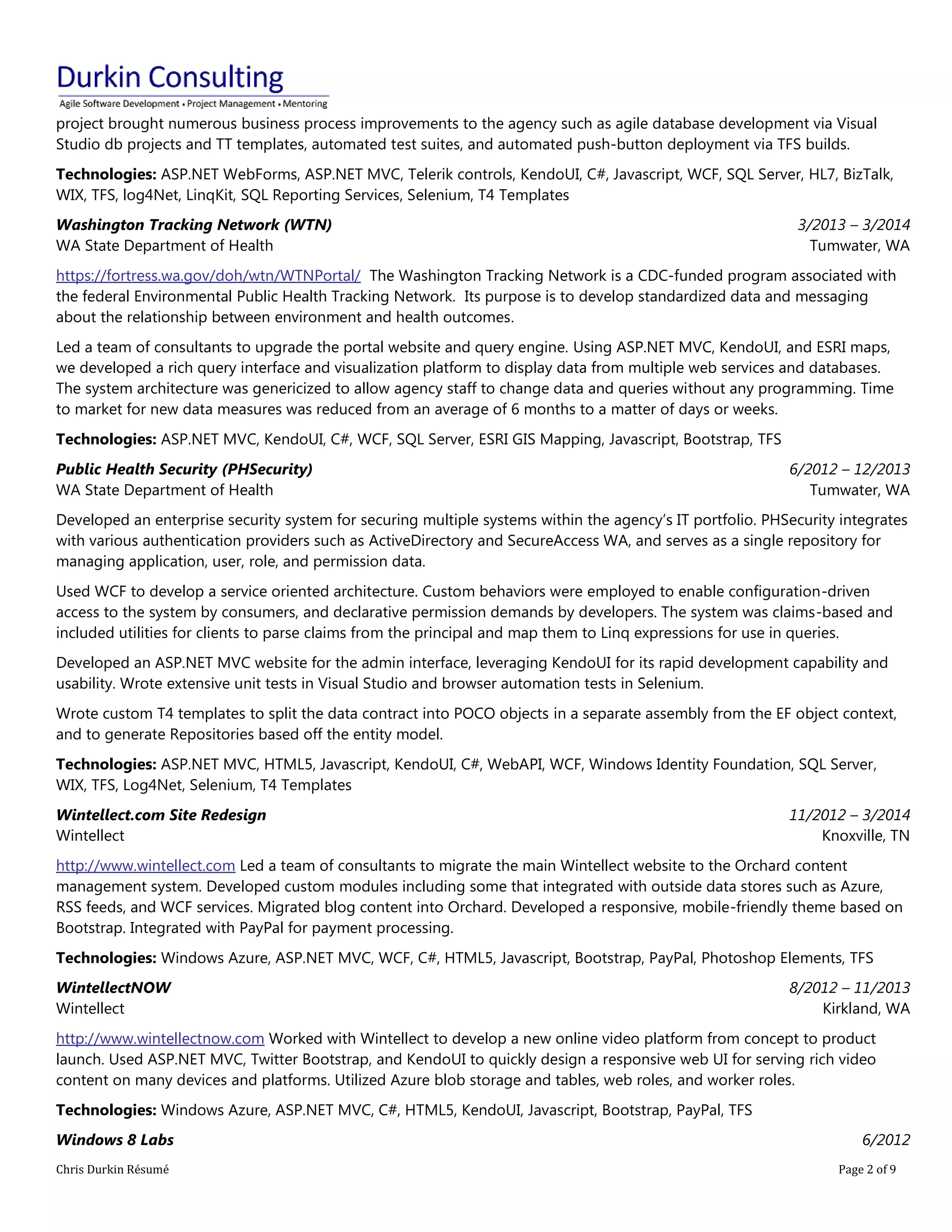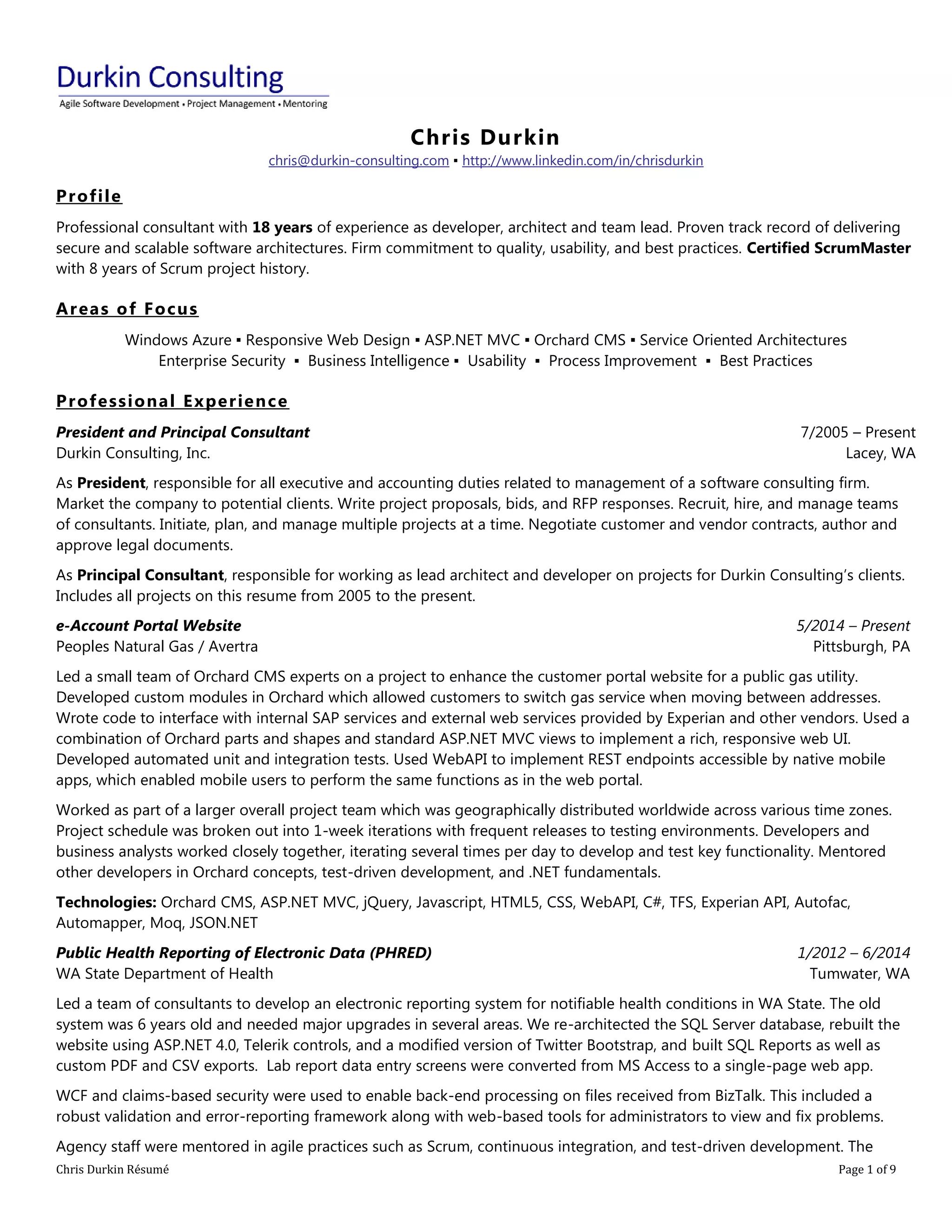 Chris Durkin is a professional consultant with 18 years of experience in software development, architecture, and team leadership, specializing in secure and scalable software architectures. He has held various roles including President of Durkin Consulting, focusing on project management, client relations, and mentoring developers, while utilizing technologies such as ASP.NET, Azure, and Orchard CMS. His extensive experience is underscored by successful projects in multiple organizations, particularly in the public health sector and e-commerce, demonstrating a commitment to quality and best practices.