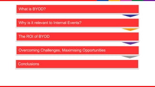 This document discusses how bring your own device (BYOD) technology can enhance collaboration at in-person meetings. It notes that BYOD allows cost savings and flexibility but also security and support challenges. The document then provides examples of how event organizers have used iPads and mobile apps to add interactivity and engagement at their events. It addresses returning value through BYOD and how to avoid common pitfalls like seeing it as too risky, distracting or complicated. The document concludes that the biggest risk is low adoption if BYOD is not implemented properly.