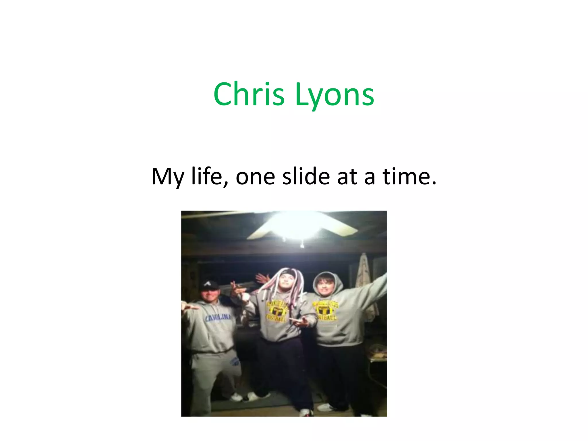 Chris Lyons is a 19-year-old who loves sports like football, working out, and hanging out with friends. He has two parents, a brother, and three dogs. Chris is transferring to East Carolina University in the fall to study History Education and pursue his goal of becoming a high school head football coach.