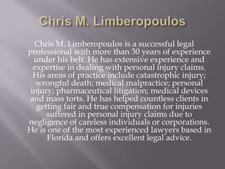 Chris M. Limberopoulos is an experienced legal professional with over 30 years of experience handling personal injury claims in areas such as catastrophic injury, wrongful death, medical malpractice, and more. As one of the most experienced lawyers based in Florida, he strives to help clients receive fair compensation through transparent guidance and understanding of their legal rights. Limberopoulos works at the reputable Florida Law Group to resolve all legal issues for clients and has successfully represented high-profile clients throughout his career. He is a member of several prestigious legal organizations and has received recognition for his work.