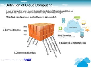 This document discusses migrating enterprises to cloud computing. It defines cloud computing as scalable IT capabilities provided as an on-demand service over the internet. There are three service models: Infrastructure as a Service (IaaS), Platform as a Service (PaaS), and Software as a Service (SaaS). There are also four deployment models: public clouds, private clouds, hybrid clouds, and community clouds. Migrating to the cloud provides benefits like lower costs, faster innovation, and elastic resources, but also raises concerns around data security, privacy, and network performance.