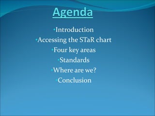 The document discusses the Texas STaR Chart, a teacher tool for planning and self-assessing technology use. It provides information on the four key areas of the STaR Chart - Teaching and Learning, Educator Preparation and Development, Administration & Support, and Infrastructure and Technology. For the presenter's school, all four areas have been at the Advanced Technology level for the past three years according to the STaR Chart. This indicates the staff is very aware of technology and how to use it, which provides support for teachers who are less technologically proficient.