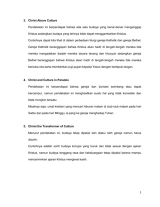 Ada 5 pendekatan hubungan antara Kristus dan budaya menurut Niebuhr, yaitu: Kristus melawan budaya, Kristus berasal dari budaya, Kristus di atas budaya, Kristus dan budaya dalam paradoks, dan Kristus mengubah budaya.