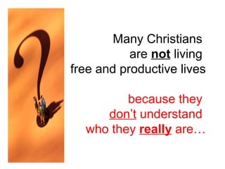This document discusses the importance of understanding one's identity as a Christian. It argues that many Christians live unfree lives because they do not recognize that they are children of God, not sinners. It provides numerous Bible verses asserting that Christians are saints, not sinners, and encourages readers to speak affirmations about their identity and worth as beloved children of God who are complete in Christ.